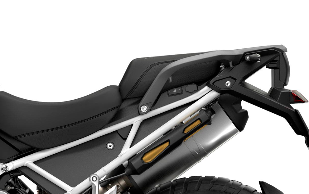 Curso da roda de 220 mm Monoshock de amortecimento semiativo Showa, com ajuste eletrônico automático de pré-carga e novo recurso de Redução de Pré-carga Ativa.