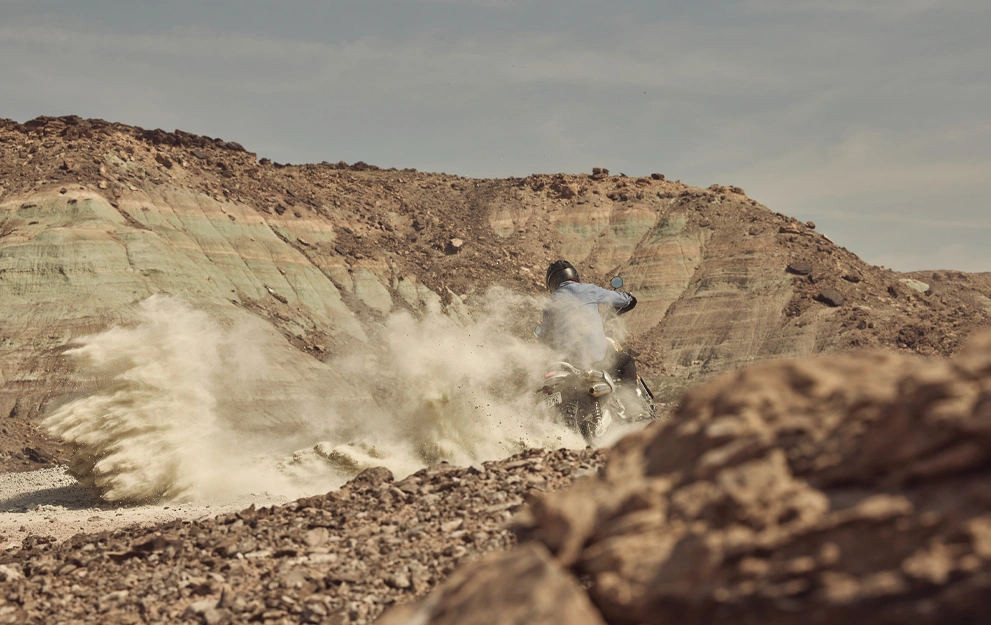Exclusivo quadro Scrambler, com suspensão premium de longo curso e roda dianteira de 21 polegadas, proporcionam uma compostura imparável no asfalto e nas trilhas.