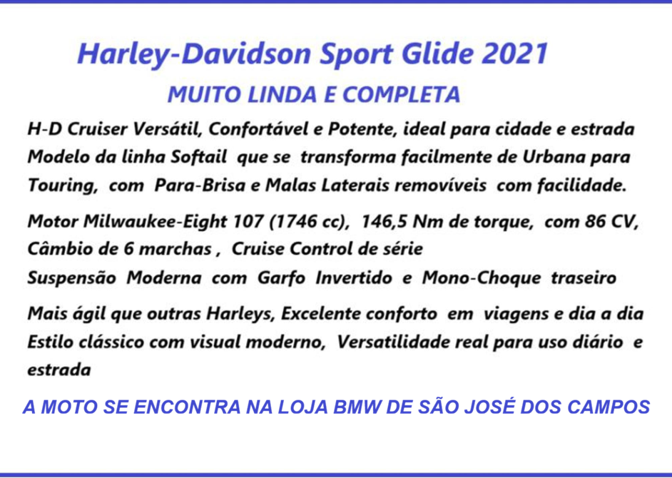A CUSTOM DEFINITIVA PARA QUEM BUSCA VERSATILIDADE. COM CARENAGEM E ALFORJES REMOVÍVEIS EM SEGUNDOS, A SPORT GLIDE É DUAS MOTOS EM UMA: UMA DEVORADORA DE ASFALTO PARA VIAGENS E UMA CRUISER MINIMALISTA PARA A CIDADE.MOTOR MILWAUKEE-EIGHT™ 107: O POTENTE V-TWIN DE 1.745 CC QUE ENTREGA UM TORQUE MASSIVO DE 14,1 KGFM JÁ EM BAIXAS ROTAÇÕES. FORÇA DE SOBRA PARA ULTRAPASSAGENS E O RONCO ICÔNICO DA MARCA.TRANSFORMAÇÃO RÁPIDA: EQUIPADA COM MINI CARENAGEM "BATWING" E ALFORJES RÍGIDOS REMOVÍVEIS. VOCÊ PODE "DESPIR" A MOTO PARA UM VISUAL CLEAN EM MINUTOS, SEM NECESSIDADE DE FERRAMENTAS.CICLÍSTICA SOFTAIL™: CHASSI LEVE E RÍGIDO QUE PRESERVA AS LINHAS CLÁSSICAS HARDTAIL, MAS OFERECE UMA SUSPENSÃO TRASEIRA DE ALTO DESEMPENHO COM AJUSTE DE PRÉ-CARGA FÁCIL.TECNOLOGIA E SEGURANÇA: ILUMINAÇÃO FRONTAL EM LED SIGNATURE, PORTA USB PARA CARREGAMENTO, CONTROLE DE CRUZEIRO (CRUISE CONTROL) DE SÉRIE E FREIOS ABS DE ÚLTIMA GERAÇÃO.MOTO DISPONIVEL NA CONCESSIONÁRIA - TRIUMPH OSTEN - SJC